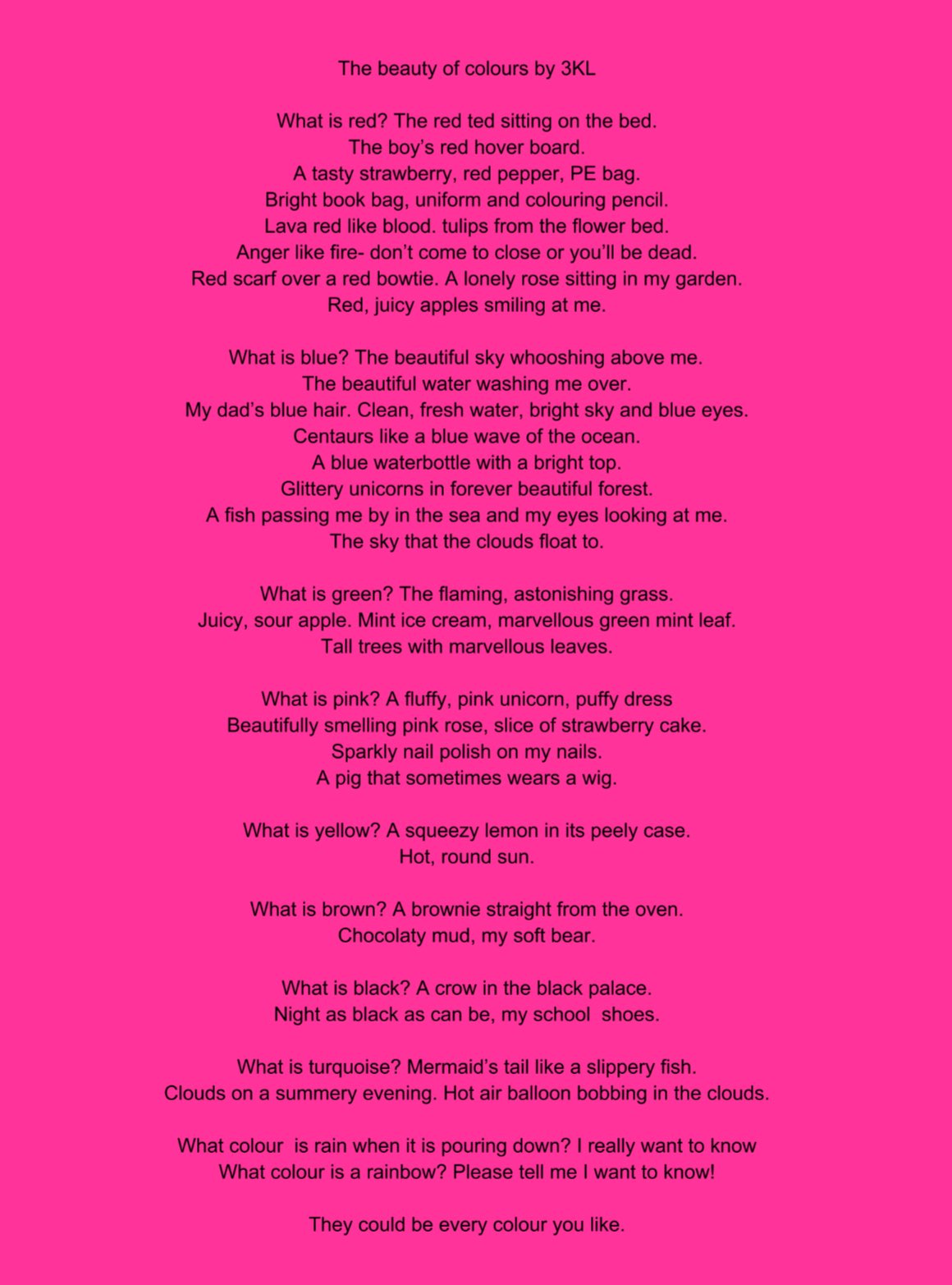Rendell Primary On Twitter 3kl Celebrated Nationalpoetryday Today Inspired By The Poem Whatispink By Christinarossetti We Created Our Own Poem About Colours Mynpdpoem Https T Co I7tnhiukxw Twitter